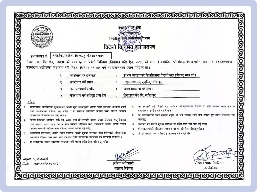 As per the Nepali government’s regulations, the purchase, sale, in- and export of historic or religious artifacts and articles containing materials of threatened flora and/or fauna is governed by the National Parks and Wildlife Conservation Act 1973 and the Ancient Monument Preservation Act 1956.
